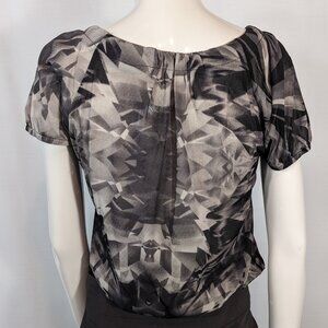 Like new. Semi-sheer knit grey and black abstract print blouse with loose puffed sleeves, pleated neckline, elasticized waist.