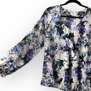 Elevate your wardrobe with this elegant floral V-neck blouse. Featuring a stunning blend of purple and black, this top is perfect for any occasion. Pair it with your favorite jeans or skirt for a chic look.