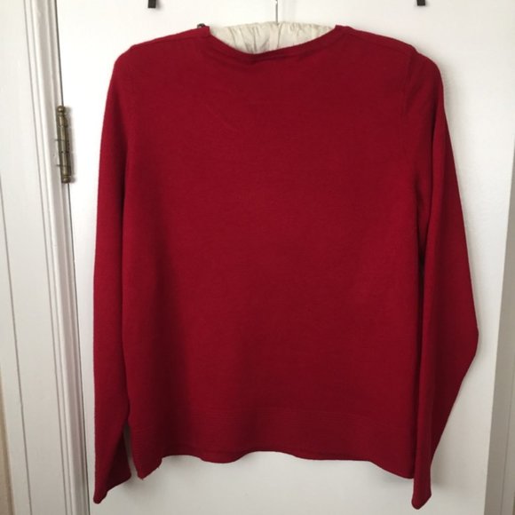 This is a pretty cherry red, lighter weight Cleo sweater with accent zippers at the shoulders.