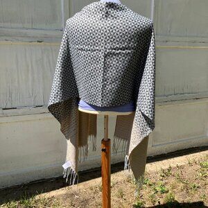 Cleo brand long scarf has geometric pattern with tan/grey colors at the ends and grey/black in the center. 100% polyester in a brushed weave for a soft feel. Tag says hand wash. Approx. 20" wide x 72" long not including fringe. Pre-owned condition: lightly used.
