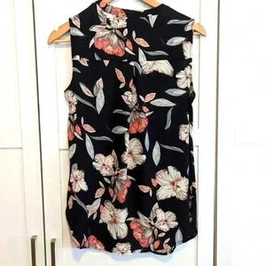 Beautiful Cleo Sleeveless Floral Top with pink and white floral laid out over a black background. V-neck with material down the front for a sophisticated look. Very lightweight and flowy. 96% polyester, 4% spandex. Length across chest 18", height from shoulder to bottom 27". In excellent condition