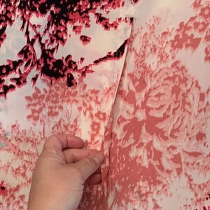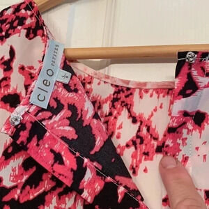 Pretty shades of pink with black and white abstract pattern. Fabric is lightweight, flowy and easy wear. Sleeveless blouse. Snap clasp in back and folded seam for interest in back. Size Large Petite. In immaculate condition.