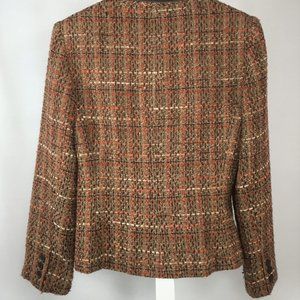 Very good condition. Tweed is a mix of rust, orange and brown. Fitted blazer has ribbon trim.
