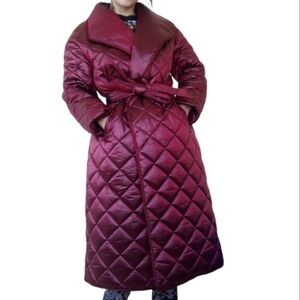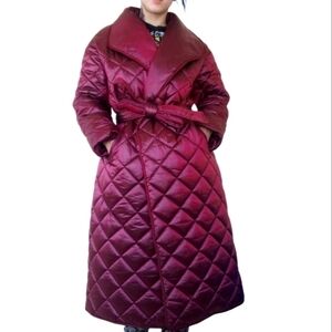 Cleo Women's Belted Quilted Puffer Trench Coat Maroon Red Large