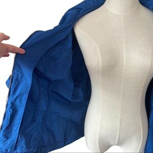 Cleo blue canvas jacket. Beautiful blue color, decorative ruffles along zipper, toggles at waist, cuffs and collar, elastic at waist in back for a flattering fit, 4 front pockets with buttons. Jacket can be dressed up and down and is very versatile! It is in excellent condition and is a ladies XL. See photos for measurements.