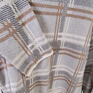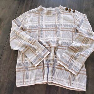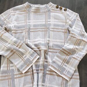 Cleo sweater, plaid in neutral colors, button detail on shoulder, mock neck. Size XXL, comfortable, barely worn. Neither the waist or cuffs are fitted - relaxed fit.