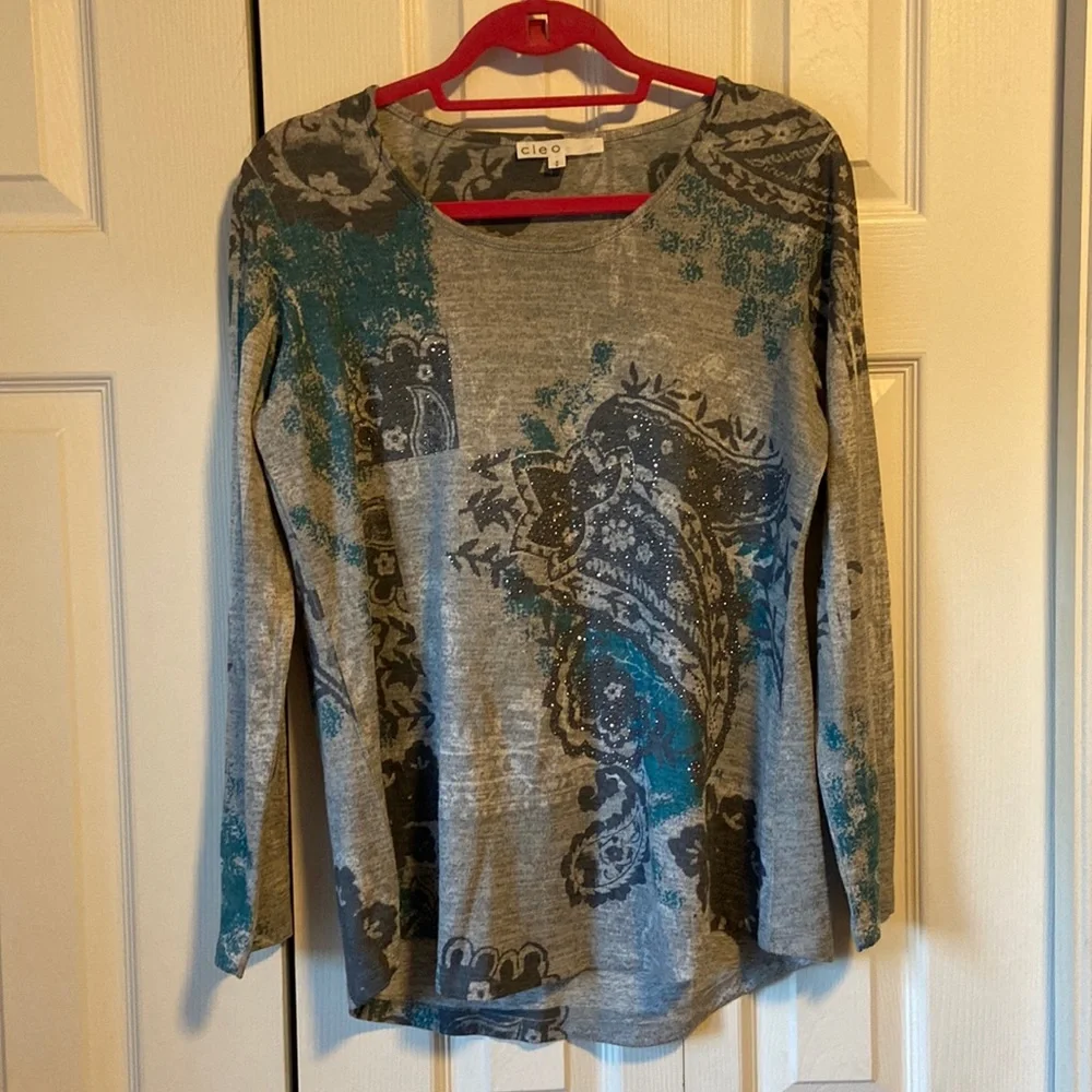 Patterned tunic type knit top, diamond accents
