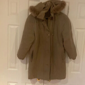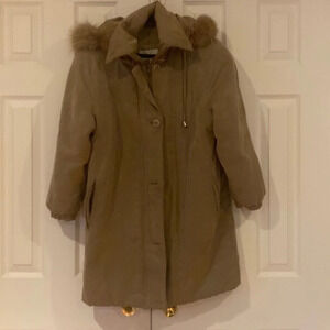 🤎⭐️Super soft water cozy Cleo petites tan faux fur trim soft suede feel puffer jacket Sz PM Approx measurements and EUC photographed same day shipping from smoke free free home