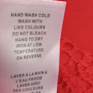 A very cute Cleo red lace top - versatile for the office to the weekend. Add some boho to your buttonup style! Size Medium and fully lined with a scalloped crochet look overlay in front. Hand wash recommended.