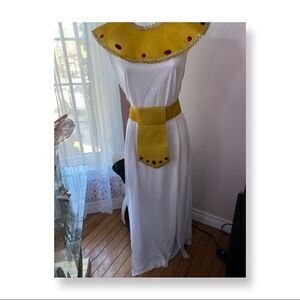 The Cleopatra costume consists of a white robe and a gold shiny headboard and also golden belt, collar and two wrist cuffs.