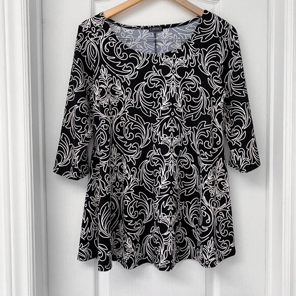 Black & white floral scroll tunic top with a flattering swing silhouette and 3/4 sleeves.