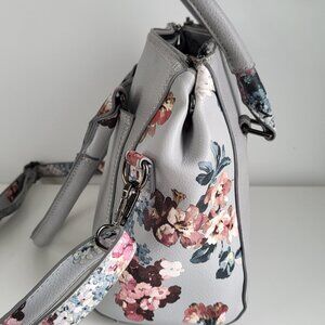 This beautiful Céline Dion satchel handbag features a soft grey faux-leather exterior with a stunning romantic multicolor floral print on the sides, handles, and detachable crossbody strap. The structured silhouette, double top handles, and multiple compartments make it perfect for everyday wear, work, or weekends.