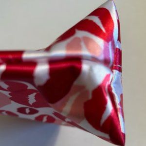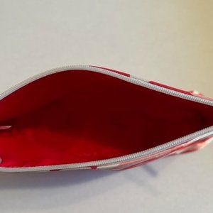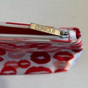 Clinique pink lip patterned cosmetic bag with white zipper and silver tone zipper tag. Lined bright pink interior. Note there are two minor dark spots on side and on one of the light pink lips as noted in the last two photos.