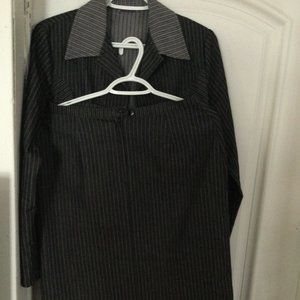 It is a 2pc suit including a jacket and a skirt, Cloarice Paris, size 2P, made in France, black white strips and black lace.