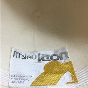 Yellow hat with green, yellow white and black feathers and bow same color as hat