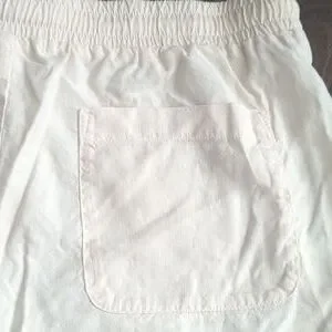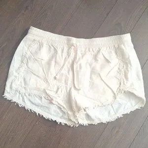 light peach/cream shorts with a comfortable drawstring waist and frayed hemline.