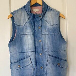 Effortlessly cool and perfect for layering, this Cloth & Stone denim puffer vest features a soft, washed chambray look with a cozy pink inner lining. Designed with snap button closures and front flap pockets for a casual yet elevated feel — ideal for pairing over a long sleeve tee or sweater.
