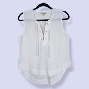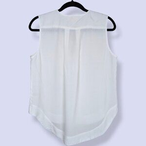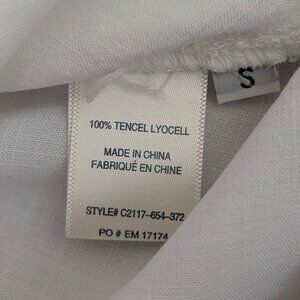 This top by Cloth & Stone (Anthropologie) is made of 100% tencel lyocell, a fabric similar to rayon that is made with environmental consciousness in mind. The top is sleeveless with a deep v neckline that has a white cord criss crossing over it. The hem of the shirt is rounded has a defined white bar along the bottom. Thre is a horizontal seam across the back with a single pleat in the center. There is little wear, if any, but no issues affecting wearability.