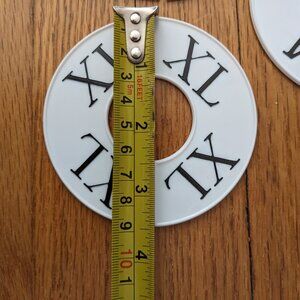 Very good condition plastic size tags to go on clothing racks. Slight yellowing on a couple of them. 24 size XL, 28 size L, 28 size M, 32 size S, 25 size XS. From a retail clothing store. White with black print.