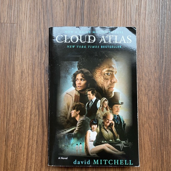 Cloud Atlas by David Mitchell. Paperback edition with a movie-themed cover. Features a mix of characters and scenes.
