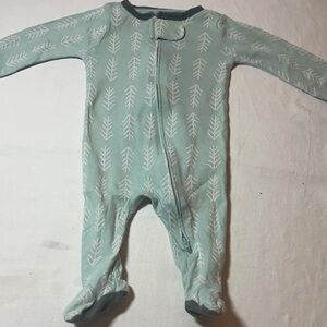 Soft teal footie with white leaf pattern. Easy zip closure. Ideal for cozy wear.
