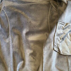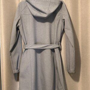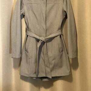 In excellent used condition. Great 3 season jacket - just in time for Fall and your outdoor walks. Classic grey colour is very versatile. Hidden zip front with snap closure, two pockets at hip area, two dome closure at sleeve cuff, belt and removable hood. Interior is lined with a soft fleece. Back length is a bit longer for added wind protection.