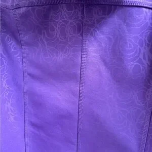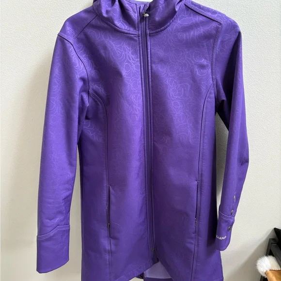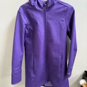Stylish purple hooded jacket with subtle floral pattern. Features a full zip and side pockets.