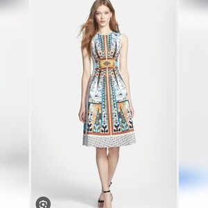 Gorgeous geometric pattern dress with a flattering strategically placed design. The spandex in the material gives it a fitted stretch. Sleeveless with a racerback.
