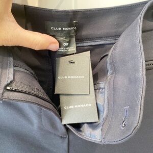 Brand new with tags. Club Monaco Aveena Pant in Navy. Size 00P. Easy polish. Zip pockets and side slits update the wardrobe staple. In soft stretch cotton for versatility and comfort. Cotton blend