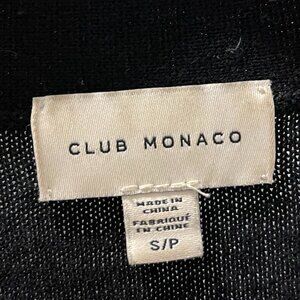 Classic black cardigan from Club Monaco, size S. Soft, lightweight fabric perfect for layering. Features a sleek, minimalist design with a button-up front and ribbed detailing on the cuffs and hem. Gently worn and in excellent condition, a versatile wardrobe staple!