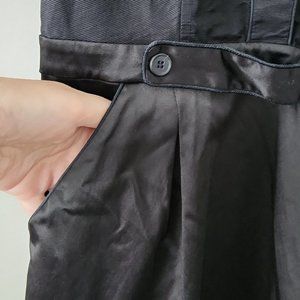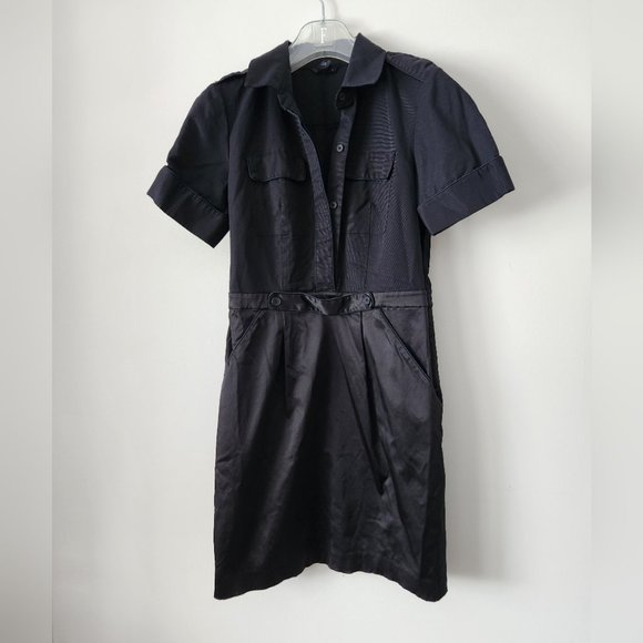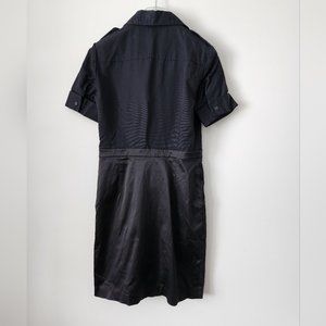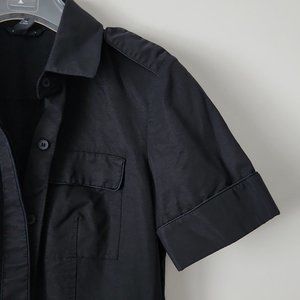 Elegant black dress with short sleeves. Features button-up front and waist tie. Perfect for versatile styling.