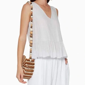 Club Monaco 'Shailyn' Blouse/Peplum Top with Bows in the Back Brand: Club Monaco. Colour: White/Light Blue. Size: Small (S). Materials: Shell is 82% viscose and 18% nylon, and the lining is 100% polyester.