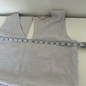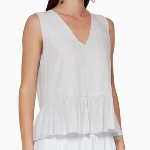 Beautiful sleeveless blouse with a flowy silhouette, a v-neck front, and a peplum shape. The back has 2 bows/ties. The top is lined, and features a ruffled hem.