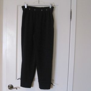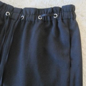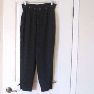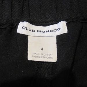 Club Monaco cropped pants. Color: Black. SIZE: 4.(S) (waist measures 14.25") Pant features an elasticized cinched rushed waistband with silver loop hole grommet detail. High waist, pull on style, two side pockets, ties on bottom near slit hem. Pants are lined.Fabric Content: 100% Polyester. Pants are in very good pre-owned condition. Minor overall wear. No stains or rips.