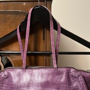 Size 11.5” X 4.5” X 2.5”. Two handles length 17”. Color purple. Material: Croc embossed leather outer and fabric lining inside. Inner zipper pocket. "Club Monaco logo on the inside as shown in photo. Used.