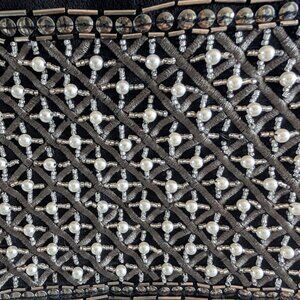Features: Hand embroidery, pearl accents, sequin detailing, metallic hardware, geometric, art deco beadwork