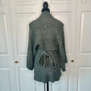 This lovely Club Monaco grey knit sweater is versatile. It is a size Small, but fits like a M. This sweater has buttons as well as a tie around the waist. The tie can be styled in multiple ways, depending on your preference. This sweater has large sleeves that fit loosely. This sweater has a beautiful knit pattern, making it unique and interesting. It is comprised of acrylic, alpaca, and merino wool. It looks brand new. It has been professionally dry cleaned ($30).