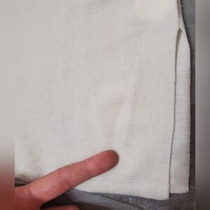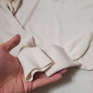 Club Monaco Ivory Cream (very creamy light yellow) Long Sleeve Pullover Shirt. Long Sweater. Johnny collar style. Size XS, see pictures for measurements. Small opening at the bottom part of the shirt (both sides). Very stretchy (see video). Merino wool blend with viscose. Small subtle stains as seen on pictures. No rip, no hole. Non smoking house.