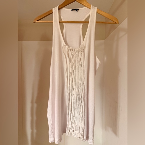 Chic and versatile tank top by Club Monaco in a soft ivory hue. This sleeveless top features a distinctive textured ruffle detail running down the center front, adding a touch of feminine flair to a classic silhouette.
