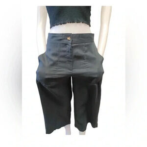 Darling navy blue these wide leg capri pants, feature two pockets and two faux. There's a double button and zipper closure along with an elasticized waistband.