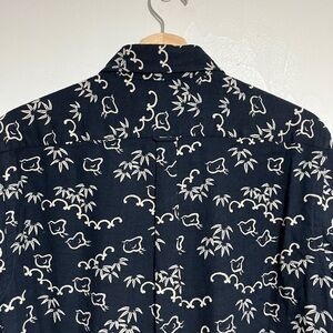 Stylish Club Monaco slim fit long-sleeve shirt in navy with an ivory bird and bamboo all-over print. Made from 100% cotton with a soft, breathable feel. Features a button front, button cuffs, chest pocket, and curved hem. Tagged size Small, made in China. Unique pattern makes it a standout piece for layering or wearing solo. Lightweight yet substantial—perfect for year-round wear.