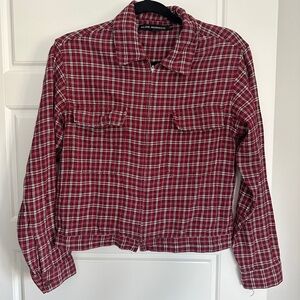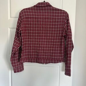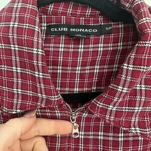 This Club Monaco utility jacket features a striking red plaid pattern, perfect for adding a pop of color to your wardrobe. Crafted from lightweight fabric, it offers a comfortable fit ideal for casual outings. The waist-length design and classic collar make it a versatile piece for layering in any season.