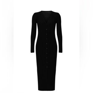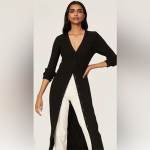 Black knit (100% Wool). Cardigan. V-neck. Long sleeves. Front button closure. 49" from shoulder to hemline.
