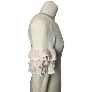 This is a cream coloured sweater with pink ruffle sleeves by Club Monaco.