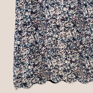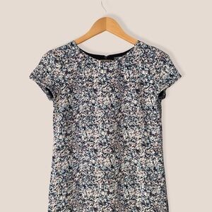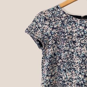 Beautiful and sophisticated short sleeve dress with scalloped hem. Print of pink, blue and black colours. Dress has a soft textured feel. Materials are 57% silk, 43% wool. Excellent condition. Size 00.