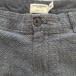 Blue patterned Club Monaco shorts. Good used condition. Waist size 30, inseam approx. 8 inches. High quality cotton-linen and synthetic materials blend.
