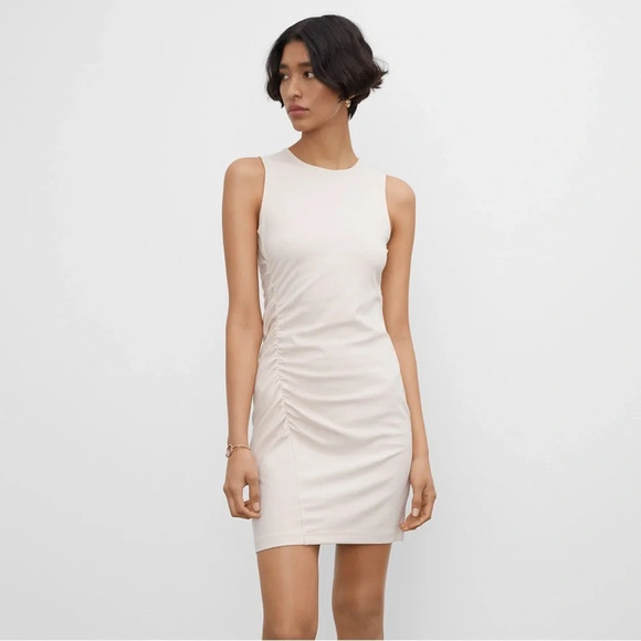 Club Monaco Side Stream Ruched Mini Dress. Baby pink. Very flattering jersey knit style elevated T shirt dress. Coquette style. Viscose/nylon/elastane blend. Size small. Excellent condition.