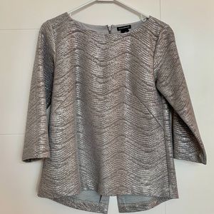 This blouse is 100% polyester, with a shiny finish and 3/4 length sleeves, along with a back slit and wide neckline. The condition is good, size small.