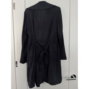 This lightweight coat is a great layering piece for chilly weather. It features a detachable belt that can be tied in the front or back. Scalloped edges at the fold over collar and lapels. On seam hip pockets. Lined.