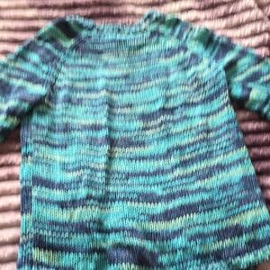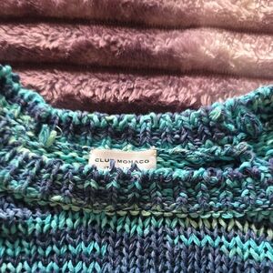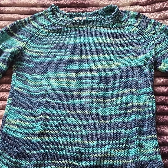 Lightweight knit crewneck in a marled teal and navy blend. Soft, breathable fabric with a subtle stripe effect. Classic casual style that layers easily.